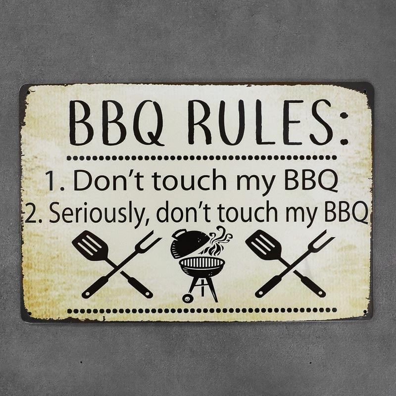 Ristkülikukujuline metallplaat. Plakat on kaetud kõrge kulumiskindlusega värviga ja kaitstud kulumisvastase lakiga. Iga eksemplar on ümbritsetud kaitsekilega. Dekoratiivne märk, mis on mõeldud grillimise armastajatele. Plaat on kinnitatud peente avadega.