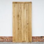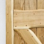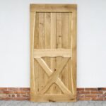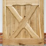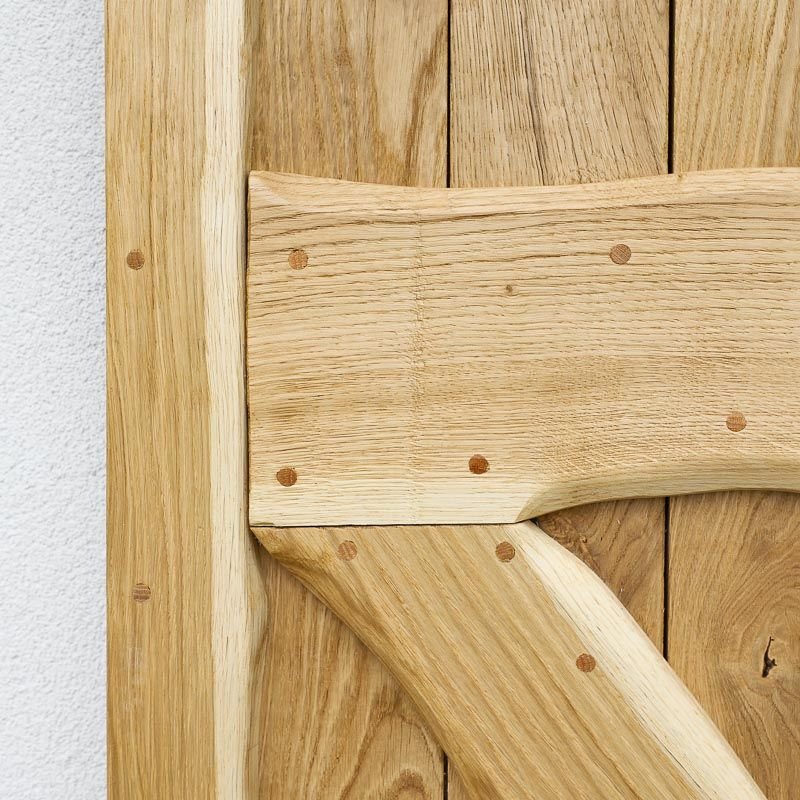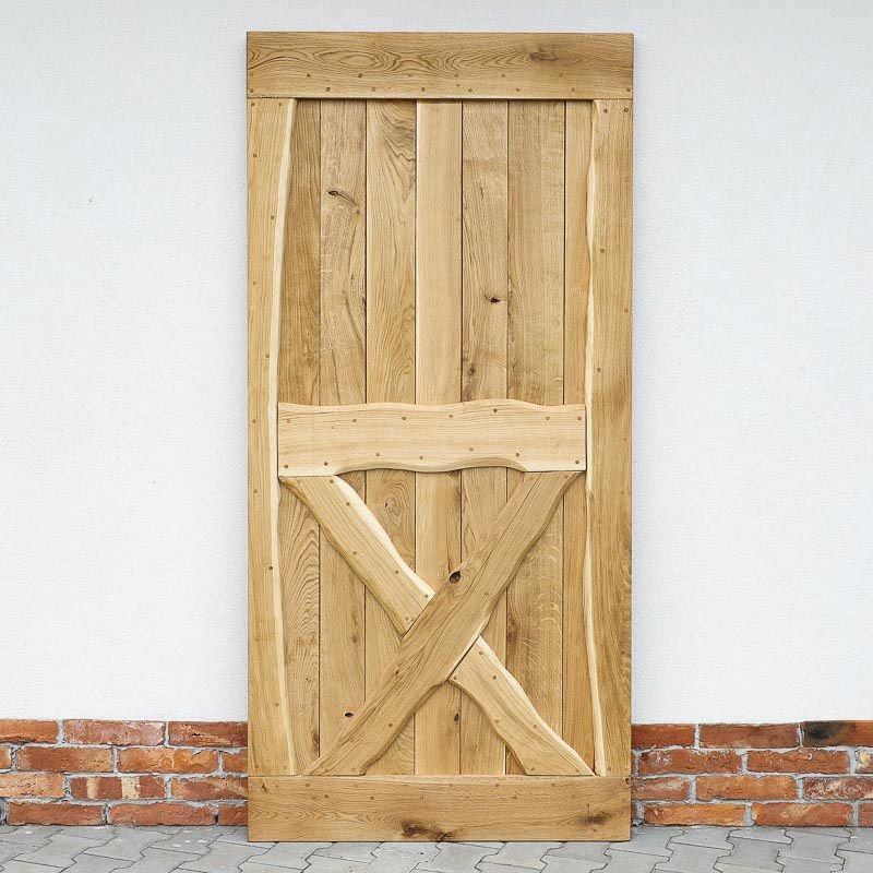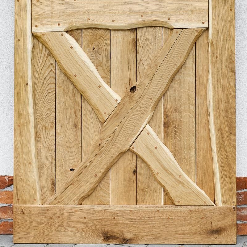 Durys pagamintos iš masyvios ąžuolo medienos. Konstrukciją sudaro vertikaliai išdėstytos 2 cm storio lentos, o rėmas – iš 4 cm storio ąžuolo masyvo. Išorinėje pusėje lentos suformuoja X formą apatinėje dalyje, suteikiančią durims ryškų, kaimišką akcentą. Kiekvienas medienos fragmentas kruopščiai atrenkamas, kad sukurtų harmoningą, tvirtą ir išskirtinį vaizdą.