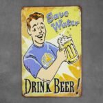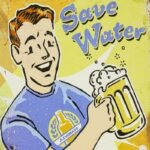 Gaminys vaizduoja žmogų su bokalu alaus ir užrašu „Taupyk vandenį, gerk alų!”.