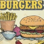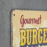 Ant produkto pavaizduotas mėsainis, bulvytės ir daržovės bei užrašas „Gourmet Burgers”.