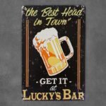 Produkte yra pintas alaus ir užrašas „Geriausia galva mieste – gaukite jį „Lucky’s Bar”.