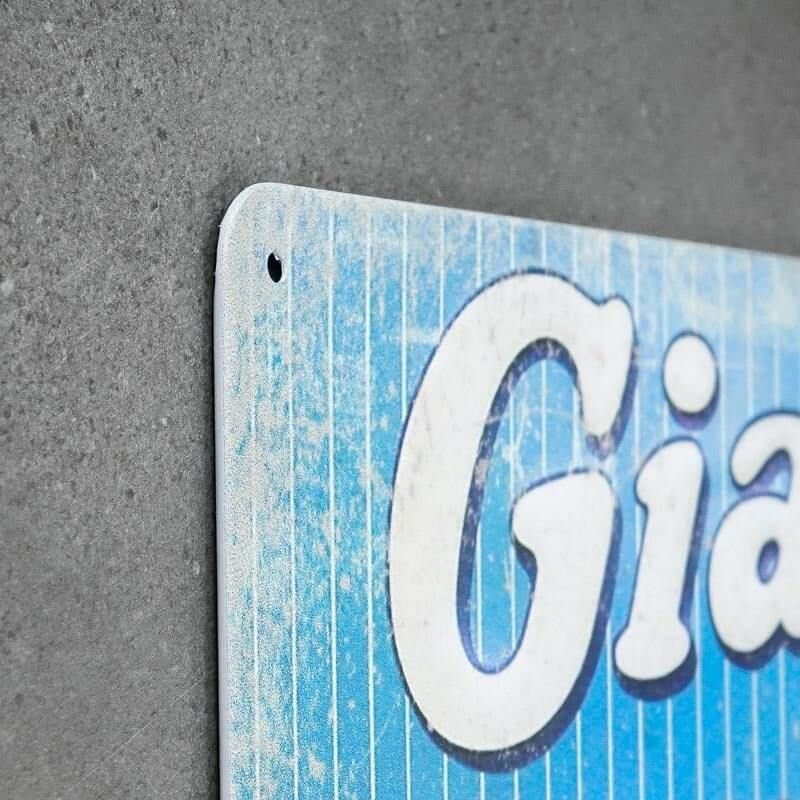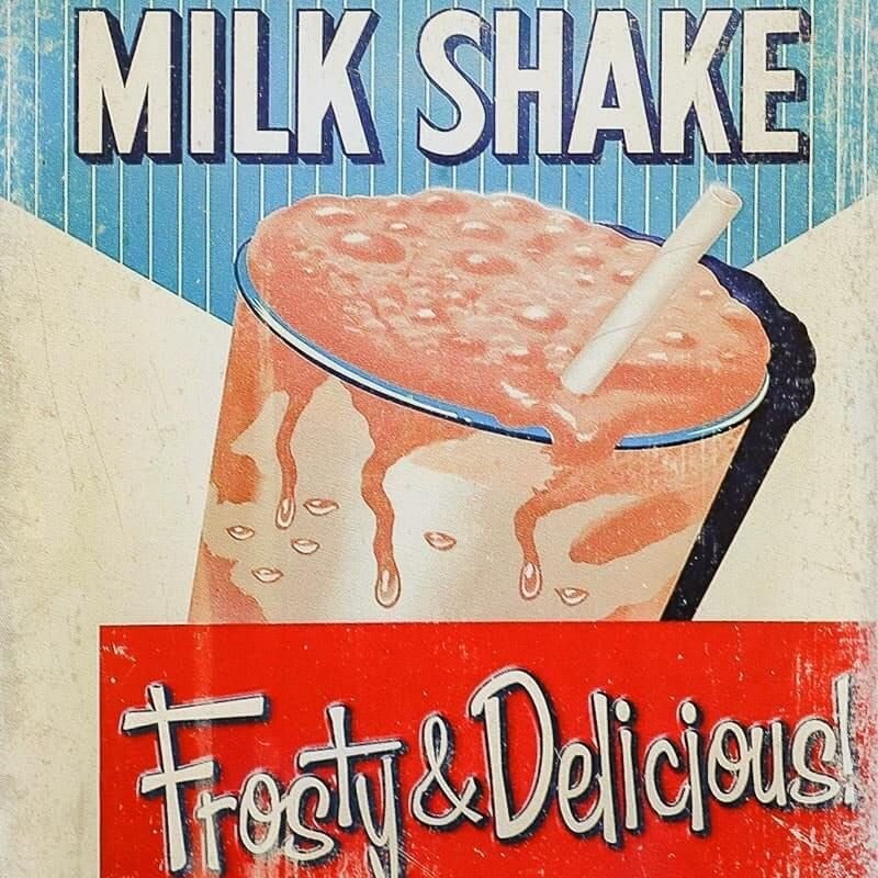 Gaminyje yra užrašas „Giant milk shake – Frosty &; delicious” ir piešinys, visas išlaikytas kaip retro plakatas.