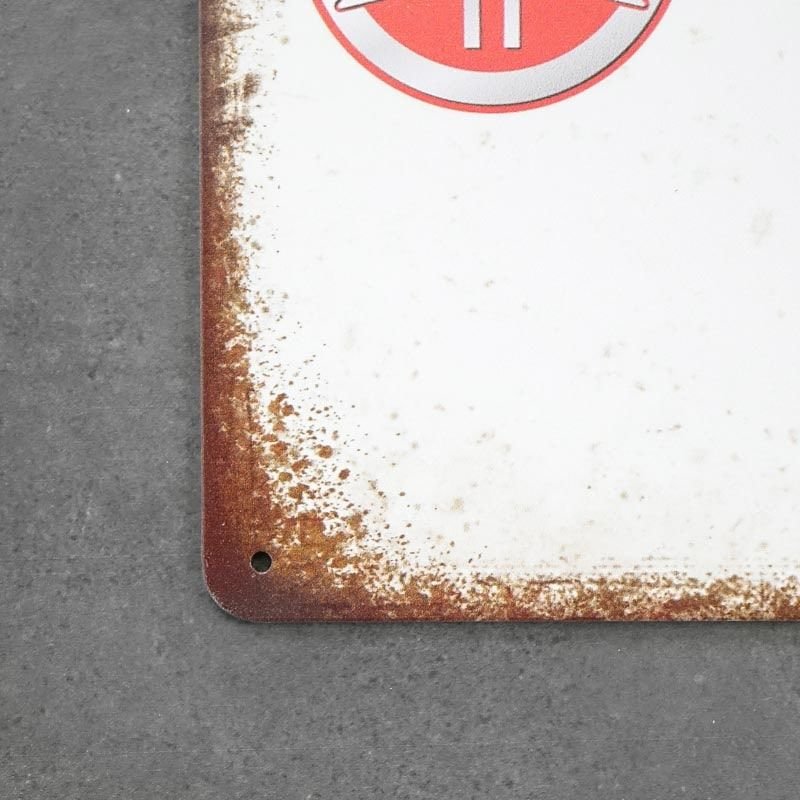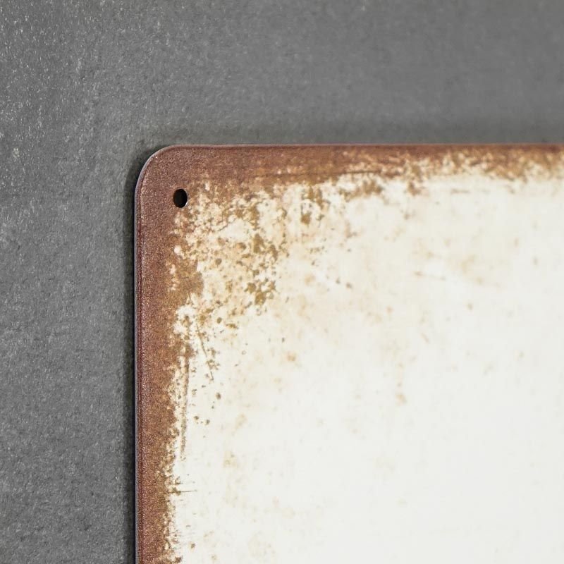 Metalinė dekoratyvinė plokštė stačiakampio formos. Plakatas yra padengtas dažais, turinčiais aukštą dilimo klasę, be to, jis turi užapvalintus kampus, kad galėtume saugiai jį naudoti. Stabilus plokštės tvirtinimas yra įmanomas dėl mažų skylių, esančių kiekviename gaminio kampe. Plakatas turi sąmoningą spalvos pasikeitimą ir įbrėžimus, kurie suteikia jam autentiškumo.